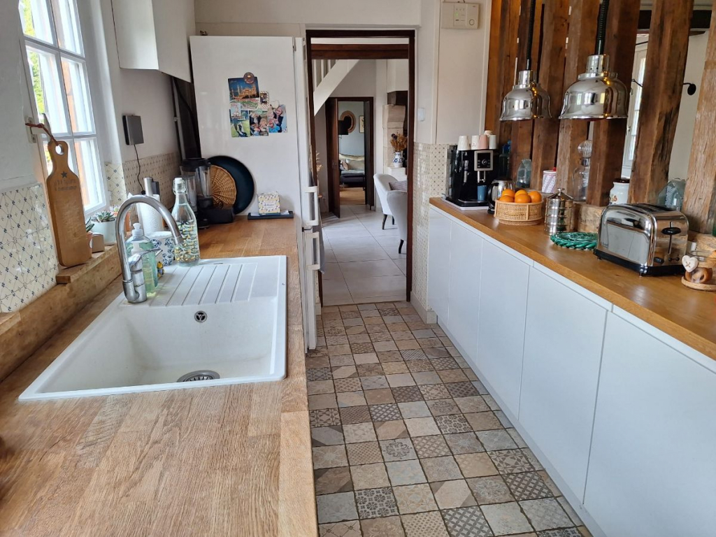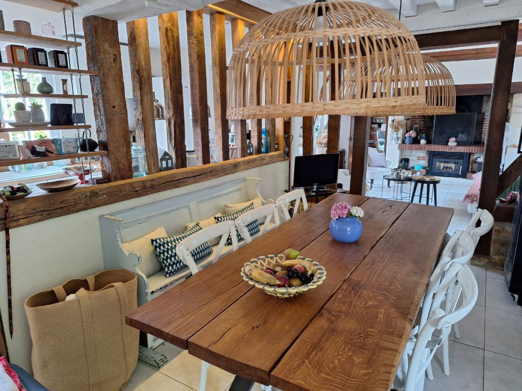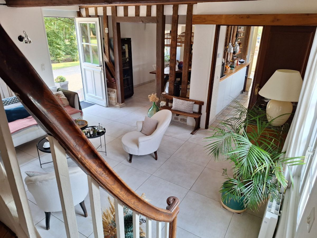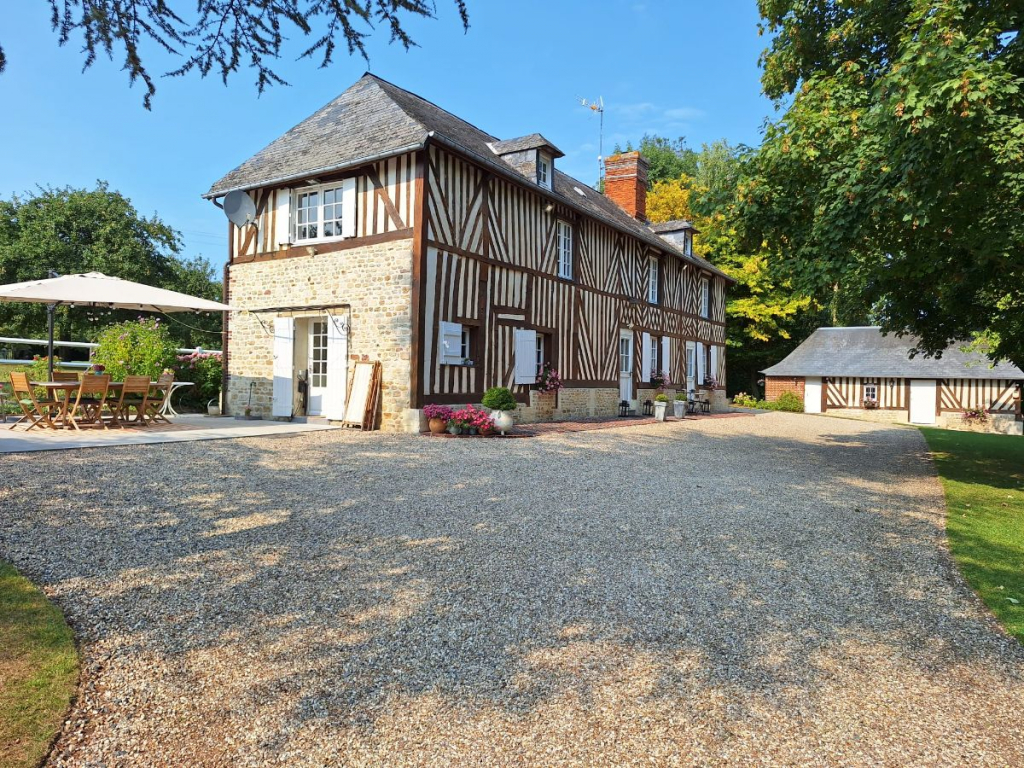 Manoir entièrement rénové avec goût d'une surface habitable d'environ 164 m² avec soubassement en pierre, colombages et toiture en tuiles ardoisées, 8 pièces principales aux éléments d'époque préservés (parquets en chêne, boiseries, cheminées):